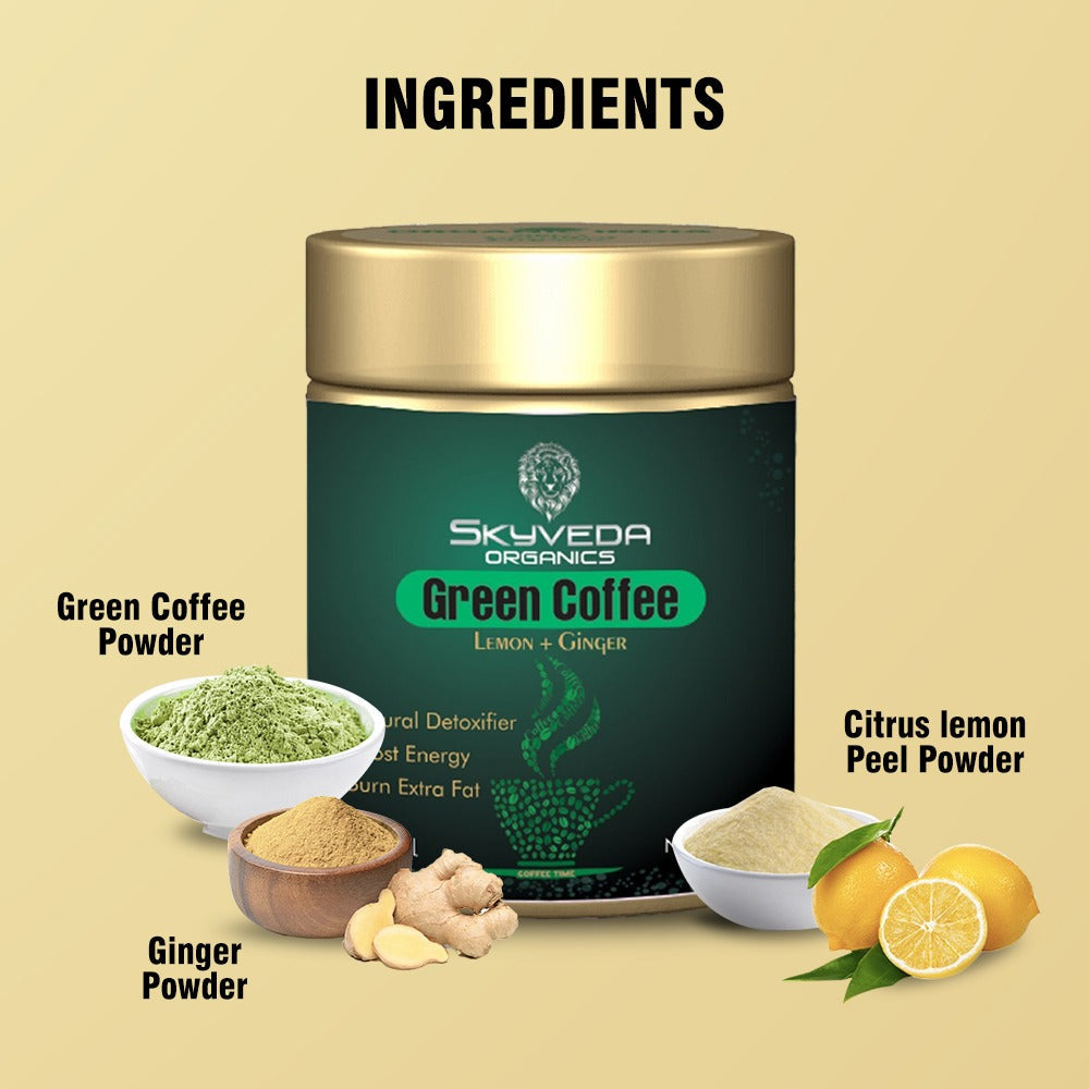 Skyveda Organics green coffee powwder contains all the goodness of green coffee powder, ginger & lemon bring you everything you need to get back in shape and feel great again
